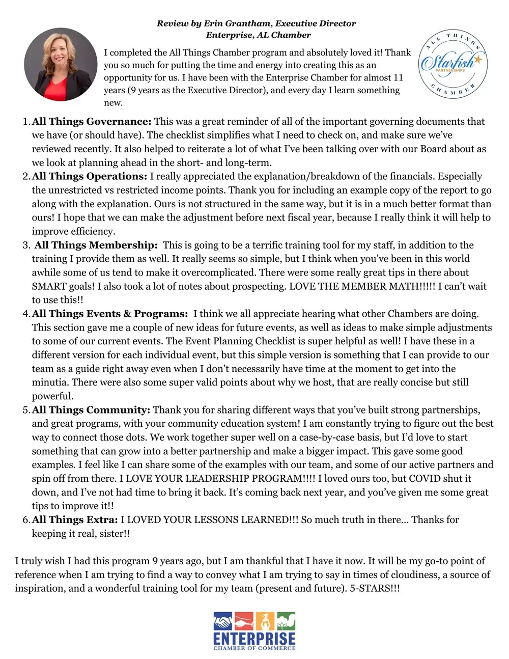 This is a digital training program for chamber staff and includes six modules and thirty lessons. The modules include Governance, Operations, Membership, Community, Types of Events and Programs and The Extras - pieces that didn’t fit into another module. Click here to find out how to purchase this program.